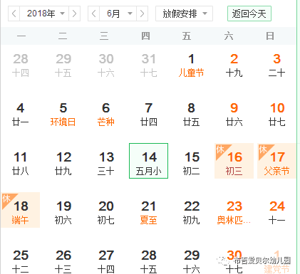 端午节放假安排:6月16日—6月18日放假,共3天。6月19日(星期二)正式来园。